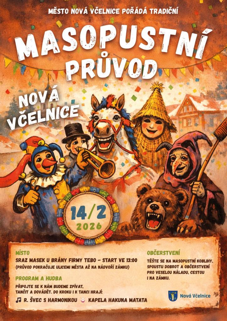 Město Nová Včelnice vás srdečně zve na bujaré oslavy masopustu! Přijďte si užít odpoledne plné masek, hudby a dobrého jídla. 🍩🎺